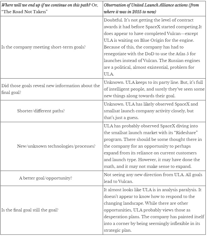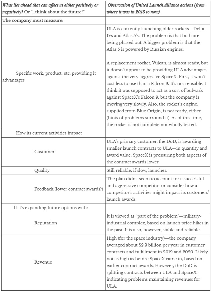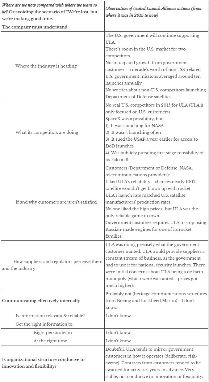 All of the above, including my anecdotal experiences, leads me to believe that 4) this gap analysis might be a helpful tool to compare a company’s actions in an industry that is changing: the space industry. Therefore, I decided to play around with this format and information, using United Launch Alliance as an example of where it might have looked as it (hopefully) conducted a gap analysis because of the changing launch landscape in the U.S.
