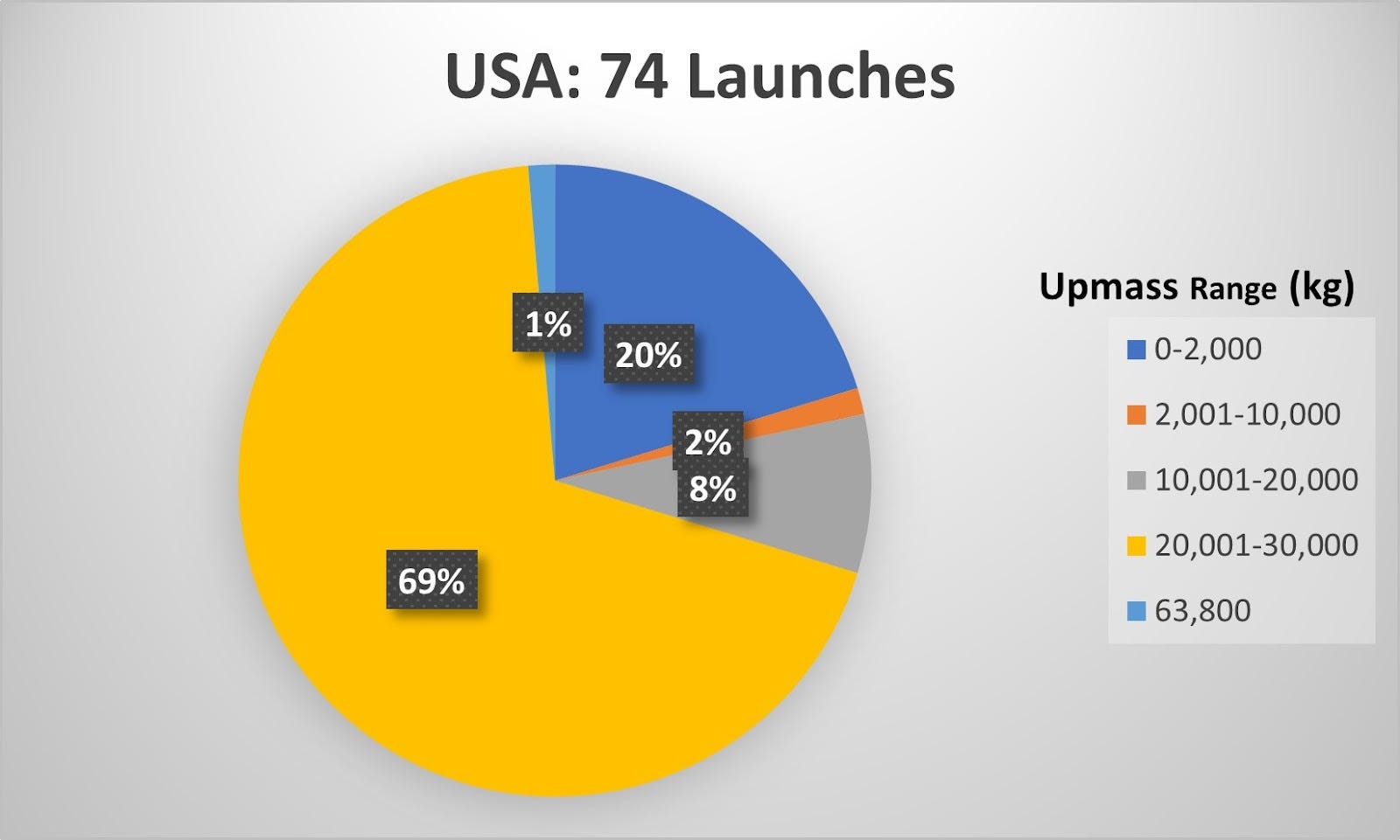 The upmass capabilities of the rockets from each nation show differing upmass ranges. For example, 88% of the 16 rocket types launched from China are incapable of lifting over 10,000 kg of payload mass to LEO. Of the 14 U.S. rocket types, 57% can lift more than 10,000 kg.